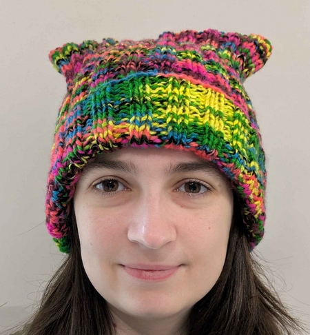 Le bonnet de la photo a été tricoté en côtes 2×2 avec 2 pelotes Vogue aux aiguilles à tricoter n°5.